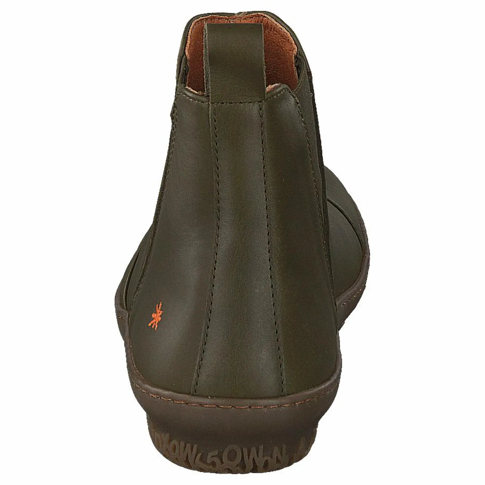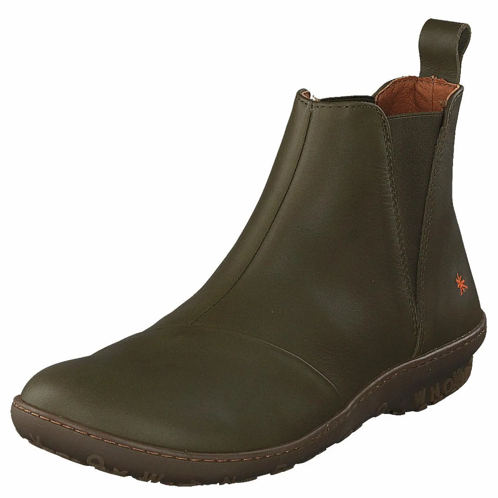 1428 Antibes är gröna läderstövlar med ett syntetiskt innermaterial. Denna stövel är en avslappnad stil, inspirerad av 60-talets mode med små blommönster och en asymmetrisk dragkedja.