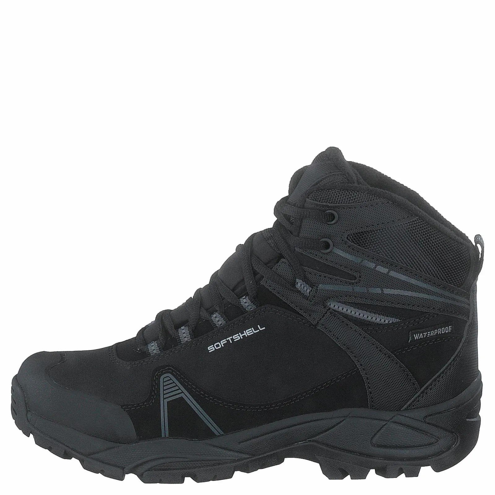 Varmfodrade vandringskängor med vattentätt membran, med delar i softshell. Mjukt och varmt fleecefoder och grovmönstrad yttersula.