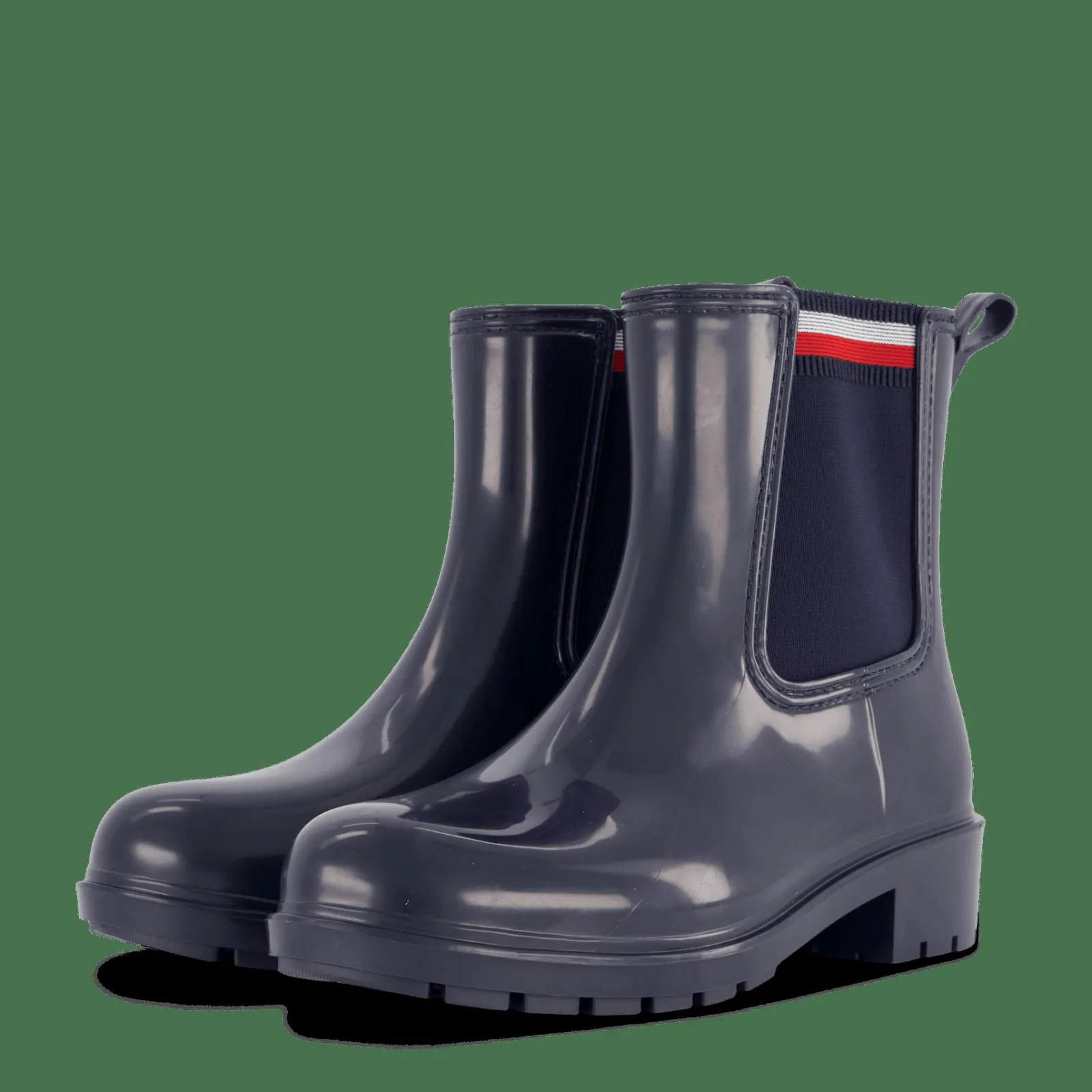 Håll dig snygg och torr i regnigt väder med dessa vattentäta gummistövlar designade för att hålla dig stadigt på fötterna. Den glansiga finishen och låga designen utstrålar tidlös chic.