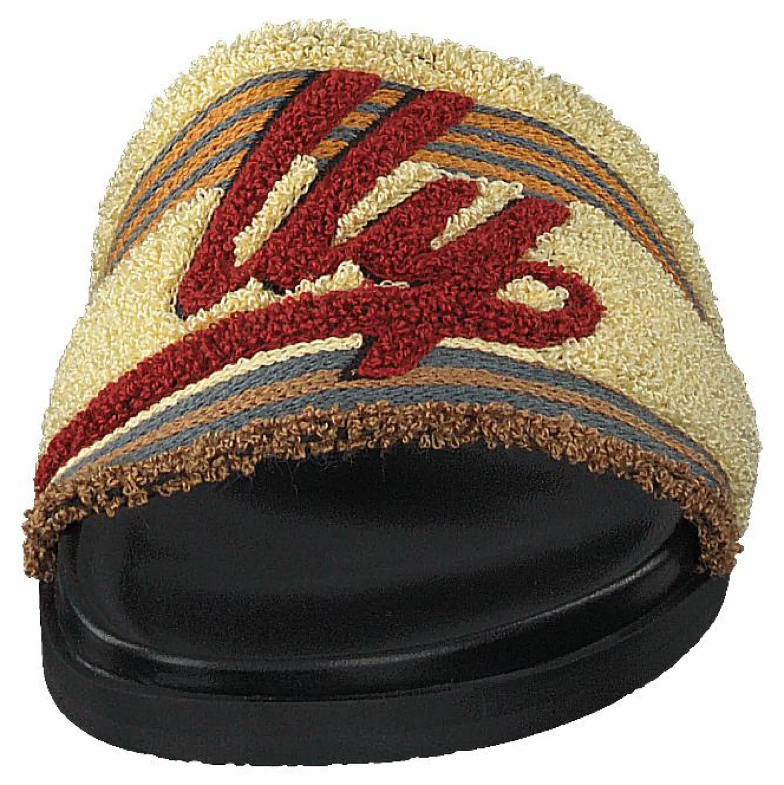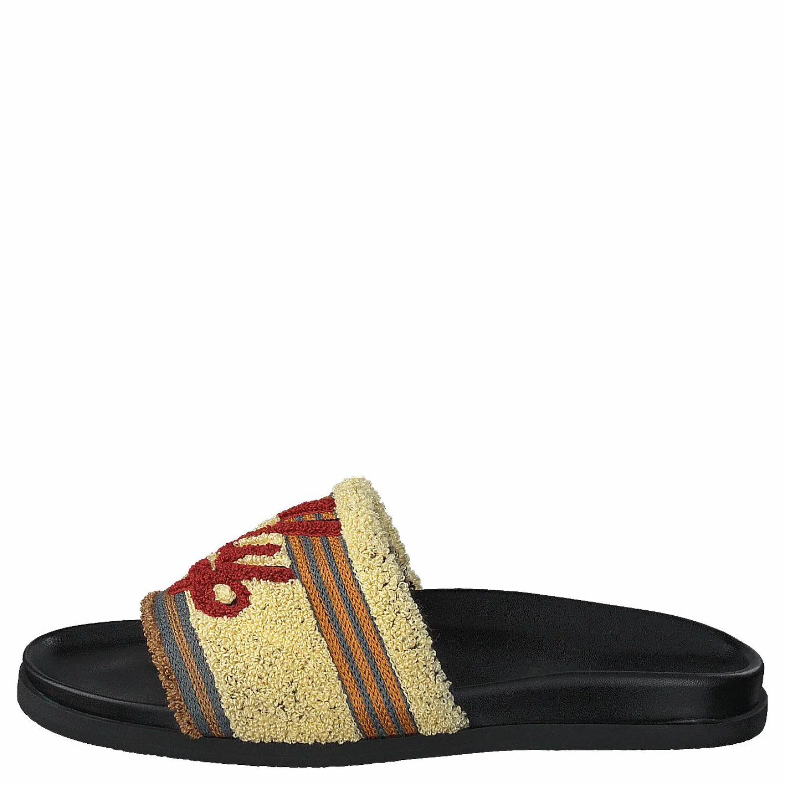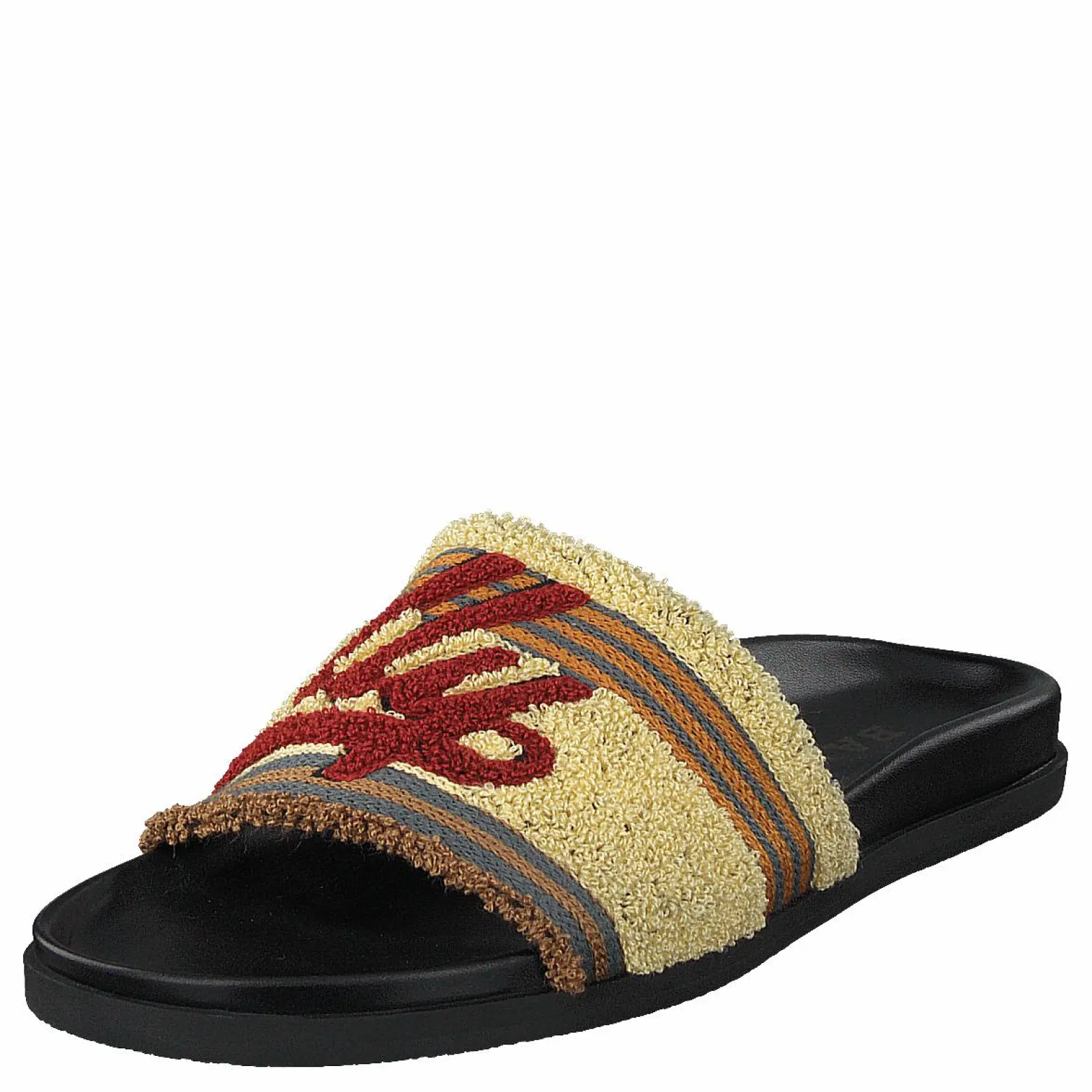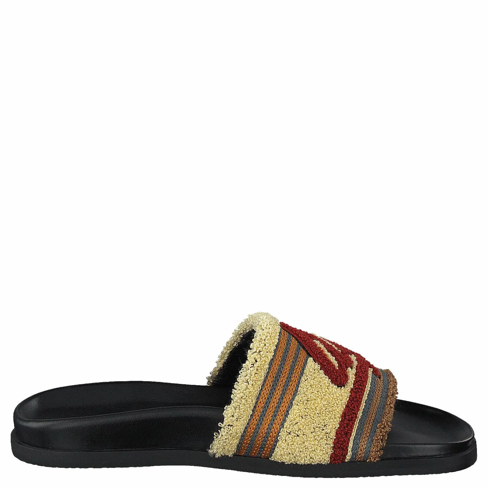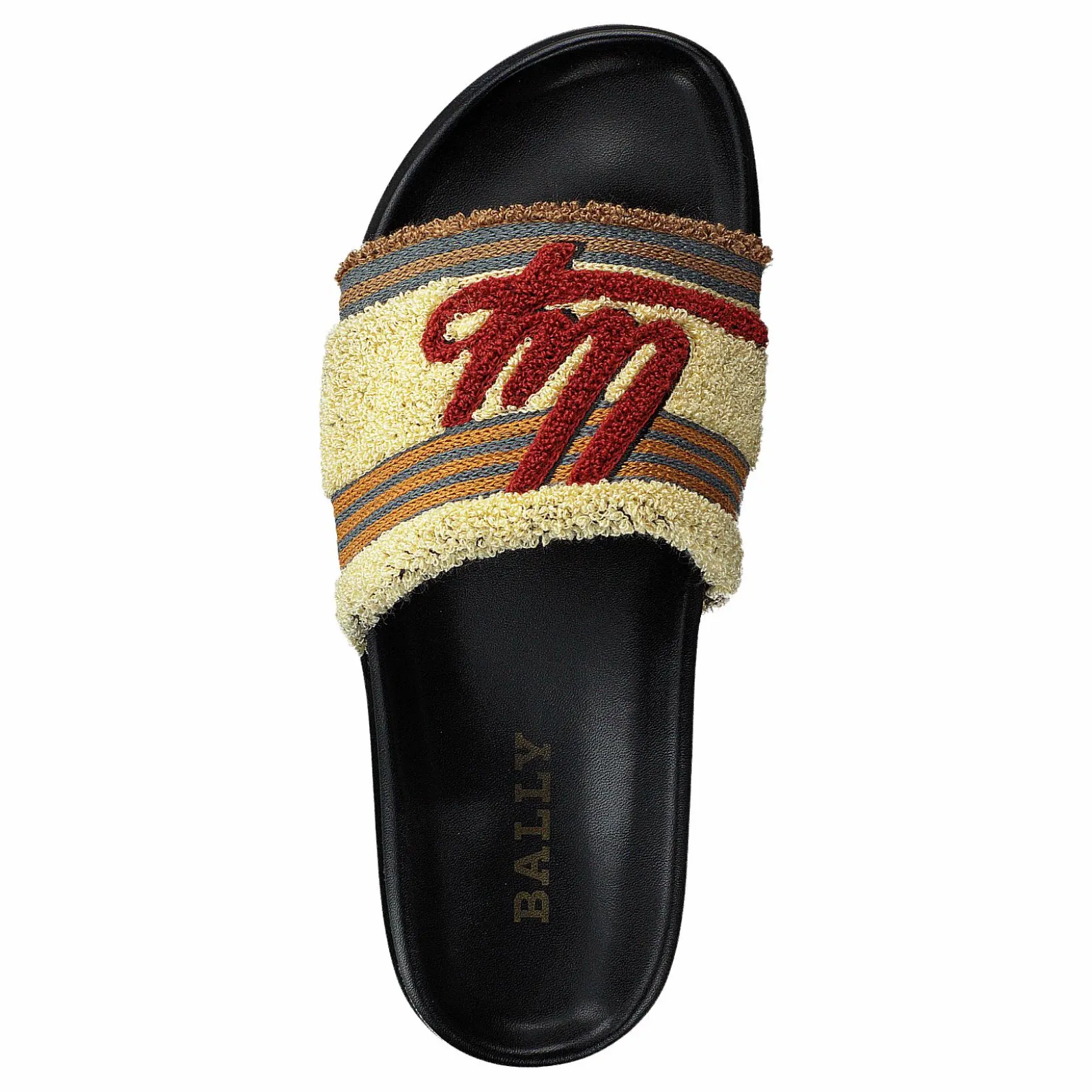 Pool Bally Sandal är en söt och bekväm sandal med en vit och brunrandig ovandel. Den har justerbar spännestängning med en vävd tygrem. Sulan är gjord av gummi, så denna sandal är perfekt för att gå på het asfalt.