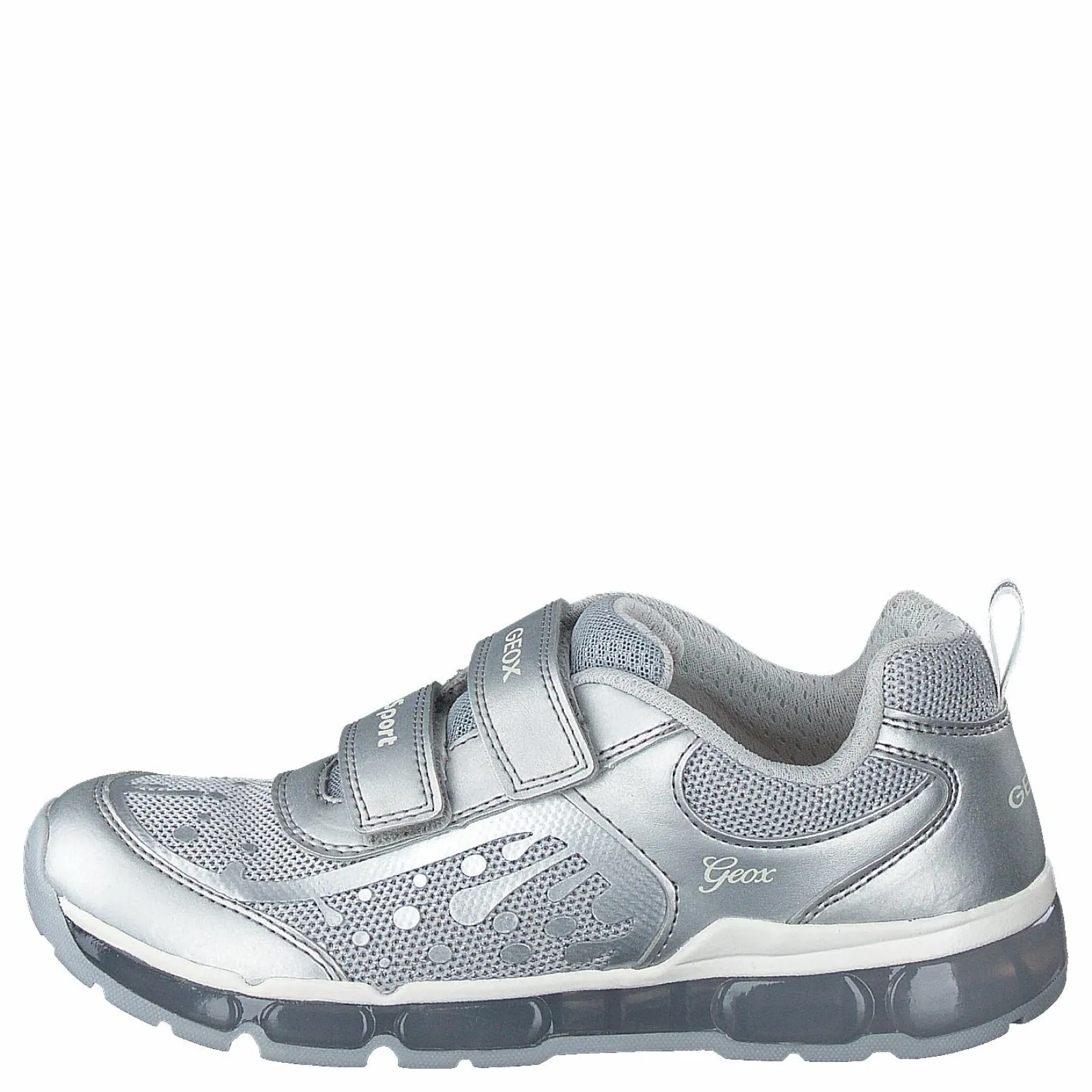 Geox skor är gjorda av tyg, textil och syntetmaterial. Geox-skor är de perfekta sneakers för barn. Denna speciella modell är en bedårande grå och silverfärg. Ett utmärkt val för din lillas första par!