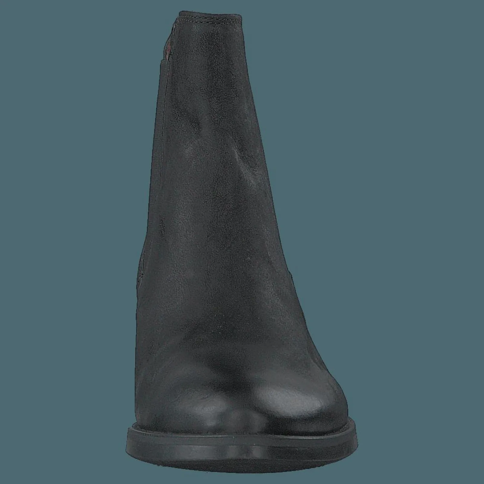 Svart högklackat stövel med tight snörning framtill och två spetskrokar upptill.